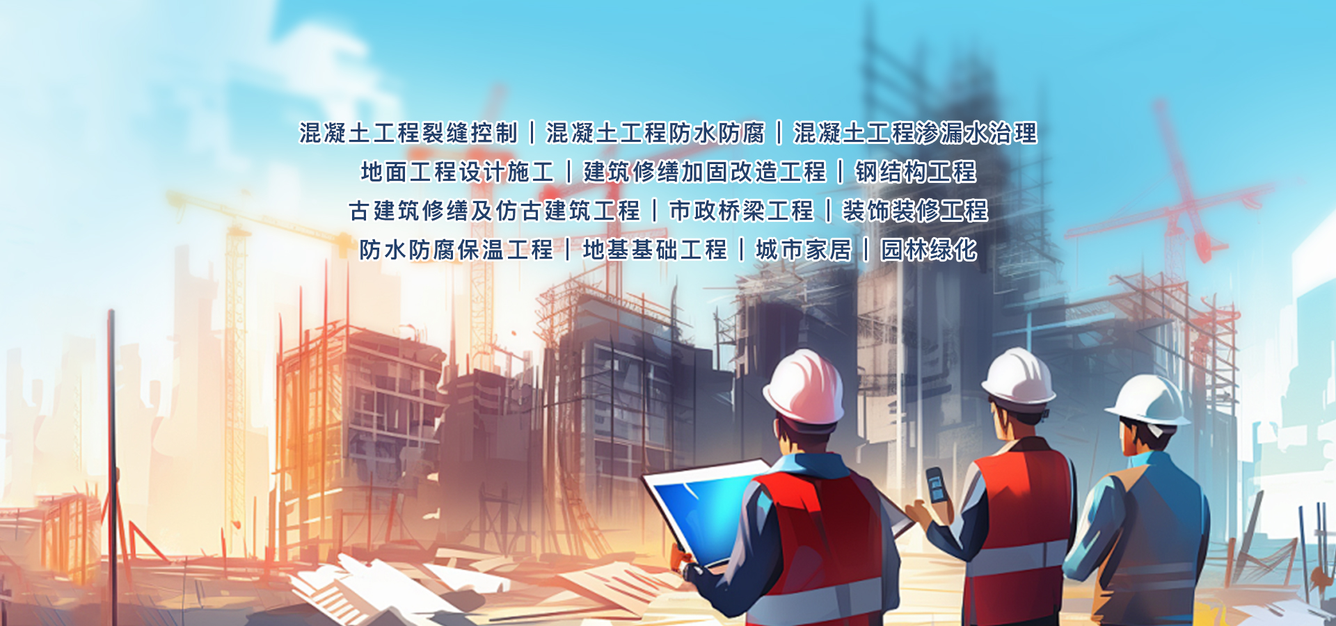 新材料领域:针对混凝土建筑开裂、渗漏、腐蚀的特点进行研发和创新,形成了混凝土裂缝控制、防水防腐、渗漏水治理、地面工程设计施工等系统,能够有效提高混凝土建筑的抗渗性、抗腐蚀性和抗裂性。主要业务范围为:隧道、管廊等地下工程;大坝、水库等水利水电工程;桥梁、铁路、公路、码头、污水处理厂等各种混凝土结构的工业与民用建筑。