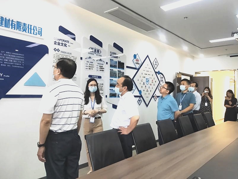 驻足会议室一侧,视察组一行领导结合企业文化墙与现场讲解,初步了解公司整体运营、市场布局、战略客户与工程案例。